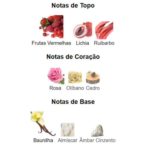 As frutas vermelhas trazem uma explosão suculenta e vibrante, abrindo a fragrância com um toque doce e alegre.