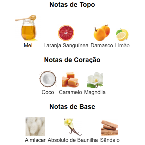 🍯 Mel – Doce, dourado e viciante, abre a fragrância com calor e sensualidade.