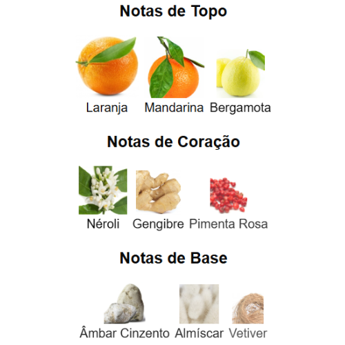 🍊 Laranja – Suculenta, brilhante e energizante, abre o perfume com vitalidade.