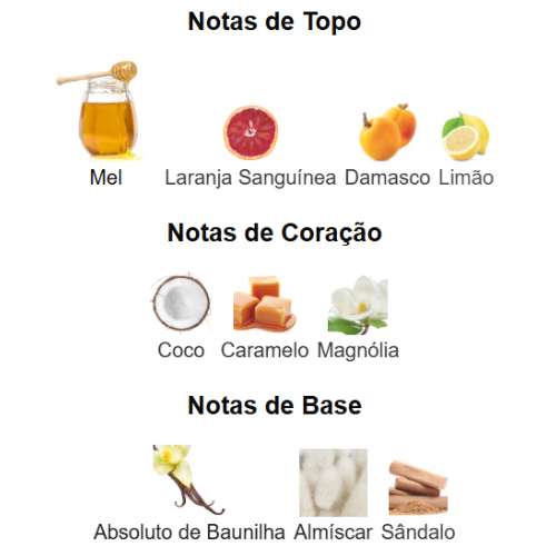 🍯 Mel – Doce, dourado e viciante, abre a fragrância com calor e sensualidade.