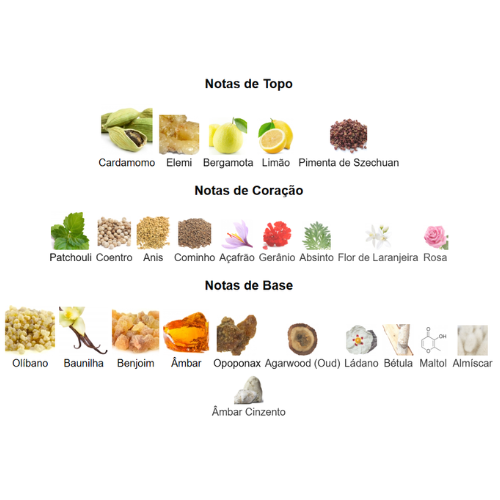 🌿🌸 Notas de Coração – Patchouli, Coentro, Anis, Cominho, Açafrão, Absinto, Gerânio, Flor de Laranjeira & Rosa